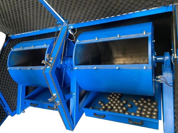 2 барабана размером Ø 800 x 900 мм, изготовленные из нержавеющей стали AISI 304 толщиной 6 мм, скорость вращения барабанов 24 ± 1 об/мин, они совершают 1400 полных оборотов и автоматически останавливаются с помощью цифрового счетчика оборотов. Поставляется с двумя лотками для сбора материала из бесцветной стали.