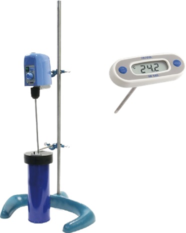 Оборудование состоит из контейнера Dewar емкостью 1000 мл, крышки, электрического миксера со скоростью вращения 300 об / мин, лопатки, основания, подставки и цифрового термометра от -50 ° до 200 ° C x 0,1 ° C.