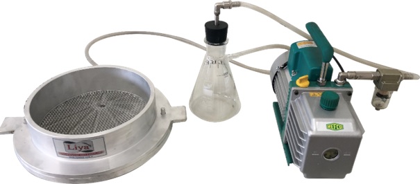 В комплекте с фильтрующей камерой, состоящей из двух частей, и крышкой из стали Ø 250 x 60 мм, стеклянным контейнером для сбора воды (эрлен) емкостью 1000 мл или 2000 мл и вакуумными всасывающими шлангами.